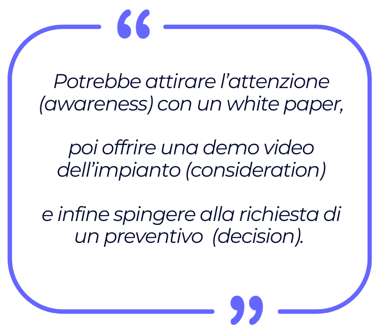 Dopo un’analisi approfondita potrebbe emergere l’esigenza di una strategia di marketing integrato (ad esempio, stand in fiera + email marketing + LinkedIn Ads).